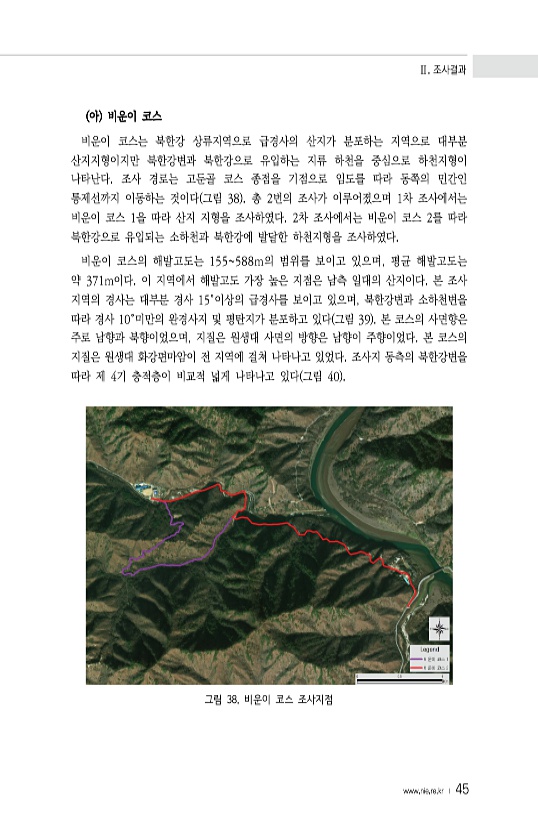 Ⅱ. 조사결과 www.nie.re.kr ? 45 아 비운이 코스 비운이 코스는 북한강 상류지역으로 급경사의 산지가 분포하는 지역으로 대부분 산지지형이지만 북한강변과 북한강으로 유입하는 지류 하천을 중심으로 하천지형이 나타난다. 조사 경로는 고둔골 코스 종점을 기점으로 임도를 따라 동쪽의 민간인 통제선까지 이동하는 것이다 그림 38 총 2번의 조사가 이루어졌으며 1차 조사에서는 비운이 코스 1을 따라 산지 지형을 조사하였다. 2차 조사에서는 비운이 코스 2를 따라 북한강으로 유입되는 소하천과 북한강에 발달한 하천지형을 조사하였다. 비운이 코스의 해발고도는 155588m의 범위를 보이고 있으며, 평균 해발고도는 약 371m이다. 이 지역에서 해발고도 가장 높은 지점은 남측 일대의 산지이다. 본 조사 지역의 경사...