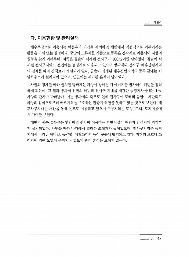 III. 조사결과 www.nie.re.kr ? 43 해수욕장으로 이용되는 여름휴가 기간을 제외하면 해빈에서 직접적으로 이루어지는 활동은 거의 없는 실정이다. 중앙의 도류제를 기준으로 동쪽은 경작지로 이용되어 지형의 원형을 찾기 어려우며, 서쪽은 곰솔이 식재된 전사구가 180m 가량 남아있다. 곰솔이 식 재된 전사구지역도 전면에는 농경지로 이용되고 있으며 방파제와 전사구-배후산림지역 의 경계를 따라 산책로가 개설되어 있다. 곰솔이 식재된 배후산림지역의 동쪽 끝에는 비 닐하우스가 설치되어 있으며, 인근에는 제거된 흔적이 남아있다. 사빈의 경계를 따라 설치된 방파제는 파랑이 강해질 때 에너지를 반사하여 해빈을 침식 하게 되는데, 그 결과 방파제 전면의 해빈과 전사구 지대를 개간한 농경지사이에는 1m 가량의 단차가...