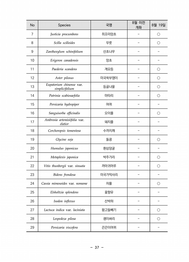 37 No Species 국명 8월 이전 개화 8월 19일 7 Justicia procumbens 쥐꼬리망초 ○ 8 Scilla scilloides 무릇 ○ 9 Zanthoxylum schinifolium 산초나무 10 Erigeron canadensis 망초 11 Paederia scandens 계요등 ○ 12 Aster pilosus 미국쑥부쟁이 ○ 13 Eupatorium chinense var. simplicifolium 등골나물 ○ 14 Patrinia scabiosaefolia 마타리 ○ 15 Persicaria hydropiper 여뀌 16 Sanguisorba officinalis 오이풀 ○ 17 Ambrosia artemisiifolia var. elatior 돼지풀 18 Corchorops...