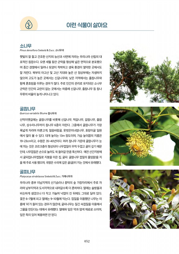 052 굴피나무 Platycarya strobilacea Siebold & Zucc. 가래나무과 우리나라 중부 이남지역의 산기슭이나 중턱의 숲 가장자리에서 주로 자 라며 남부지역과 도서지역으로 내려갈수록 더 흔하하다. 열매는 솔방울과 비슷하게 생겼으나 더 작고 가늘며 낙엽이 진 뒤에도 그대로 달려 있다. 꽃은 67월에 피고 열매는 910월에 익는다. 껍질을 이용했던 나무는 이 름에 ‘피’가 들어 있는 경우가 많은데, 굴피나무는 질긴 속껍질을 이용해서 그물을 만든다는 데에서 유래했다. 열매와 잎은 약과 염색 재료로 쓰이며, 잎은 독이 있어 복용하면 안 된다. 굴참나무 Quercus variabilis Blume 참나무과 산막이옛길에는 굴참나무를 비롯해 신갈나무, 떡갈나무, 갈참나무, 졸참 나무, 상수리나무까지...