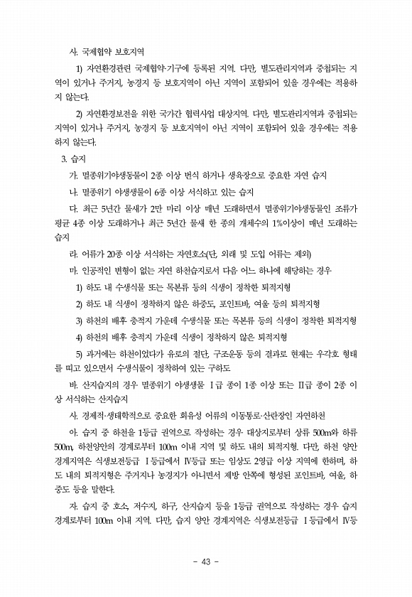 43 사. 국제협약 보호지역 1 자연환경관련 국제협약·기구에 등록된 지역. 다만, 별도관리지역과 중첩되는 지 역이 있거나 주거지, 농경지 등 보호지역이 아닌 지역이 포함되어 있을 경우에는 적용하 지 않는다. 2 자연환경보전을 위한 국가간 협력사업 대상지역. 다만, 별도관리지역과 중첩되는 지역이 있거나 주거지, 농경지 등 보호지역이 아닌 지역이 포함되어 있을 경우에는 적용 하지 않는다. 3. 습지 가. 멸종위기야생동물이 2종 이상 번식 하거나 생육장으로 중요한 자연 습지 나. 멸종위기 야생생물이 6종 이상 서식하고 있는 습지 다. 최근 5년간 물새가 2만 마리 이상 매년 도래하면서 멸종위기야생동물인 조류가 평균 4종 이상 도래하거나 최근 5년간 물새 한 종의 개체수의?이상이 매년 도래하는 습지 라. 어류가?종...