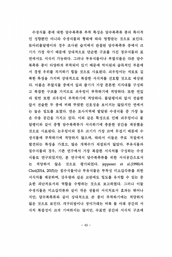54 국가장기생태연구 2010년부터 2013년까지 이루어진 순천만의 저서무척추동물 군집에 대한 조사에서는 총 59종의 출현종이 확인되었으며, 출현종들은 환형동물과 절지동물이 각각 24종씩으로 가장 많았고, 연체동물은 8종, 기타 3종이었다. 한편, 2007년부터 2013년까지 수행된 함평만의 저 서무척추동물 군집에 대한 조사에서는 총 242종의 출현종이 확인되었는데, 출현종들은 환형 동물이 118종으로 가장 많았고, 절지동물은 61종, 연체동물은 47종, 기타 16종 등으로 구성 되었다 그림 3-8 순천만과 함평만에서 저서무척추동물 군집의 출현종수가 이렇게 많은 차이를 보이는 것은 두 지역의 갯벌 환경과 기질의 조성이 기본적으로 많이 다르기 때문이다. 순천만은 지역에 따 라 갈대 군락이나 칠면초 군락과 같은...