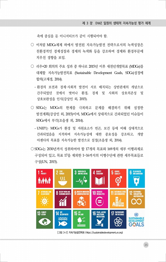35 제 3 장 DMZ 일원의 생태적 지속가능성 평가 체계 축에 중심을 둔 이니셔티브가 같이 시행되어야 함. ○ 이처럼 MDGs체제 하에서 발전된 지속가능발전 전략으로서의 녹색성장은 친환경적인 경제성장과 경제의 녹색화 등을 강조하며 경제와 환경부문에 치우친 경향을 보임. ○ 리우+20 회의의 주요 성과 중 하나로 2015년 이후 새천년개발목표 MDGs 를 대체할 지속가능발전목표 Sustainable Development Goals, SDGs 설정에 합의 고재경, 2014 환경의 보전과 경제·사회적 발전이 서로 배치되는 상반관계의 개념으로 간주되었던 것에서 벗어나 환경, 경제 및 사회의 상호의존성 및 상호보완성을 인식 강상인 외, 2015 ○ SDGs는 MDGs의 한계를 극복하고 문제를 해결하기 위해 설정한 ...