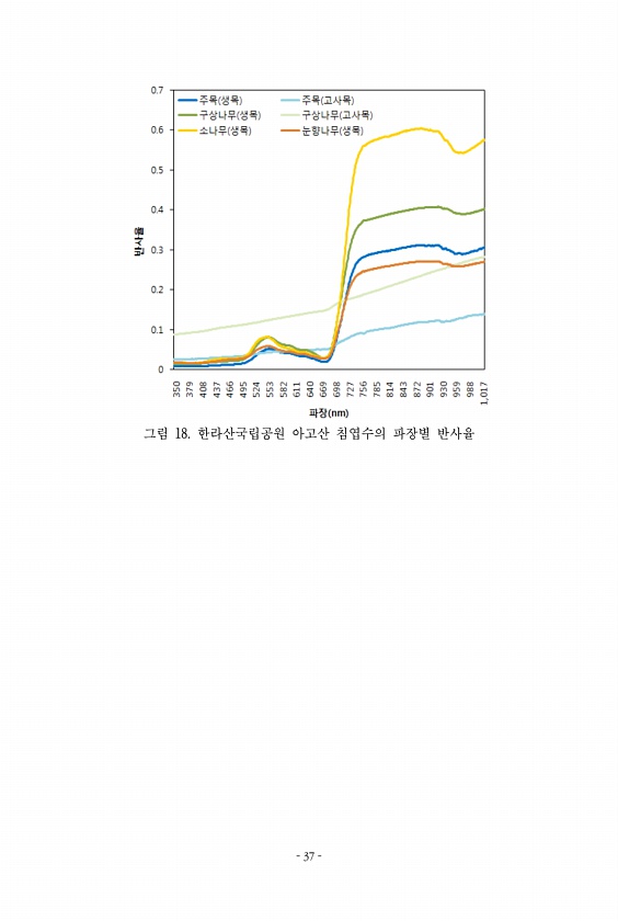 그림 18. 한라산국립공원 아고산 침엽수의 파장별 반사율 37