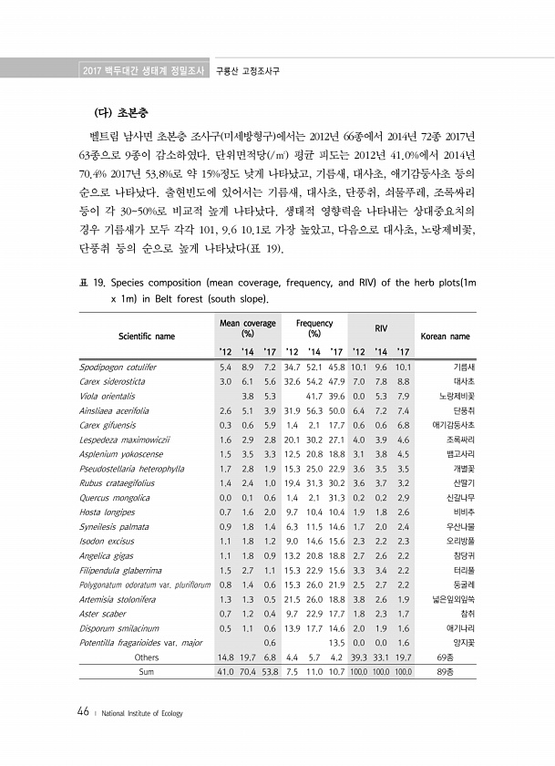 2017 백두대간 생태계 정밀조사 구룡산 고정조사구 46 ? National Institute of Ecology 다 초본층 벨트림 남사면 초본층 조사구 미세방형구 에서는 2012년 66종에서 2014년 72종 2017년 63종으로 9종이 감소하였다. 단위면적당 /㎡ 평균 피도는 2012년 41.0%에서 2014년 70.4% 2017년 53.8%로 약 15%정도 낮게 나타났고, 기름새, 대사초, 애기감둥사초 등의 순으로 나타났다. 출현빈도에 있어서는 기름새, 대사초, 단풍취, 쇠물푸레, 조록싸리 등이 각 3050%로 비교적 높게 나타났다. 생태적 영향력을 나타내는 상대중요치의 경우 기름새가 모두 각각 101, 9.6 10.1로 가장 높았고, 다음으로 대사초, 노랑제비꽃, 단풍취 등의 순으로 높게 나타났다 표...