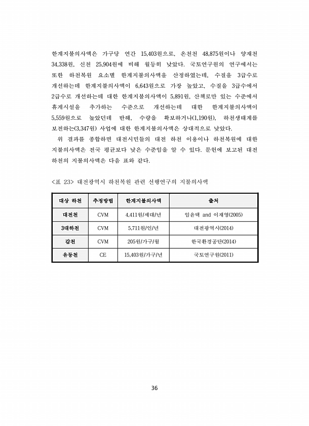 36 한계지불의사액은 가구당 연간 15,403원으로, 온천천 48,875원이나 양재천 34,338원, 신천 25,904원에 비해 월등히 낮았다. 국토연구원의 연구에서는 또한 하천복원 요소별 한계지불의사액을 산정하였는데, 수질을 3급수로 개선하는데 한계지불의사액이 6,643원으로 가장 높았고, 수질을 3급수에서 2급수로 개선하는데 대한 한계지불의사액이 5,891원, 산책로만 있는 수준에서 휴게시설을 추가하는 수준으로 개선하는데 대한 한계지불의사액이 5,559원으로 높았던데 반해, 수량을 확보하거나 1,190원 , 하천생태계를 보전하는 3,347원 사업에 대한 한계지불의사액은 상대적으로 낮았다. 위 결과를 종합하면 대전시민들의 대전 하천 이용이나 하천복원에 대한 지불의사액은 전국 평균보다 낮은 수준임을 알 수 ...