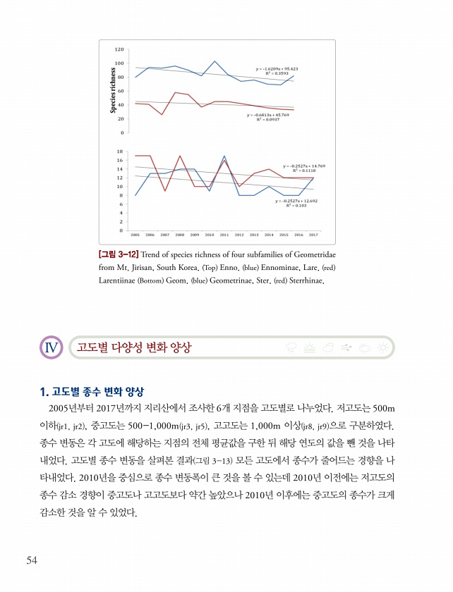 54 [그림 3-12] Trend of species richness of four subfamilies of Geometridae from Mt. Jirisan, South Korea. Top Enno. blue Ennominae, Lare. red Larentiinae Bottom Geom. blue Geometrinae, Ster. red Sterrhinae. IV 고도별 다양성 변화 양상 1. 고도별 종수 변화 양상 2005년부터 2017년까지 지리산에서 조사한 6개 지점을 고도별로 나누었다. 저고도는 500m 이하 jr1, jr2 , 중고도는 500-1,000m jr3, jr5 , 고고도는 1,000m 이상 jr8, jr9 으로 구분하였다. 종수 변동은 각 고도에 해당하는 지점의 전체 평균값을 구한...