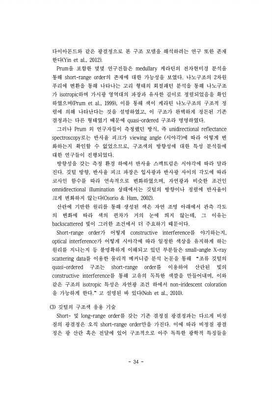 34 다이아몬드와 같은 광결정으로 본 구조 모델을 해석하려는 연구 또한 존재 한다 Yin et al., 2012 Prum을 포함한 몇몇 연구진들은 medullary 케라틴의 전자현미경 분석을 통해 short-range order의 존재에 대한 가능성을 보였다. 나노구조의 2차원 푸리에 변환을 통해 나타나는 고리 형태의 회절패턴 분석을 통해 나노구조 가 isotropic하며 가시광 영역대의 파장과 유사한 길이로 정렬되었음을 확인 하였으며 Prum et al., 1999 , 이를 통해 색이 케라틴 나노구조의 구조적 정 렬에 의해 나타난다는 것을 설명하였고, 이 구조가 완벽하게 정돈된 기존 결정과는 다른 형태였기 때문에 quasi-ordered 구조라 명명하였다. 그러나 Prum 외 연구자들이 측정했던 방식, 즉...