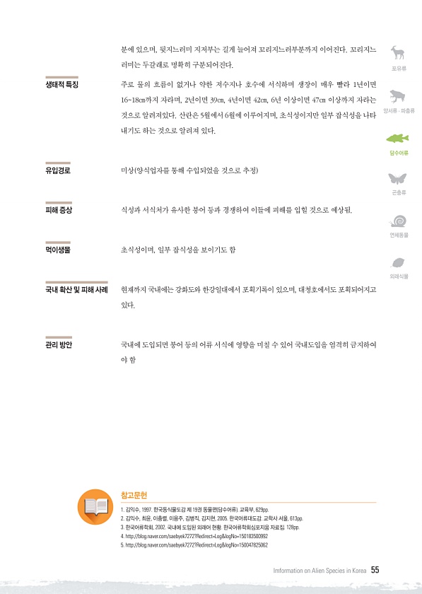 포유류 양서류 · 파충류 담수어류 곤충류 연체동물 외래식물 Imformation on Alien Species in Korea 55 분에 있으며, 뒷지느러미 지저부는 길게 늘어져 꼬리지느러부분까지 이어진다. 꼬리지느 러미는 두갈래로 명확히 구분되어진다. 생태적 특징 주로 물의 흐름이 없거나 약한 저수지나 호수에 서식하며 생장이 매우 빨라 1년이면 1618㎝까지 자라며, 2년이면 39㎝, 4년이면 42㎝, 6년 이상이면 47㎝ 이상까지 자라는 것으로 알려져있다. 산란은 5월에서 6월에 이루어지며, 초식성이지만 일부 잡식성을 나타 내기도 하는 것으로 알려져 있다. 유입경로 미상 양식업자를 통해 수입되었을 것으로 추정 피해 증상 식성과 서식처가 유사한 붕어 등과 경쟁하여 이들에 피해를 입힐 것으로 예상됨. 먹이생...