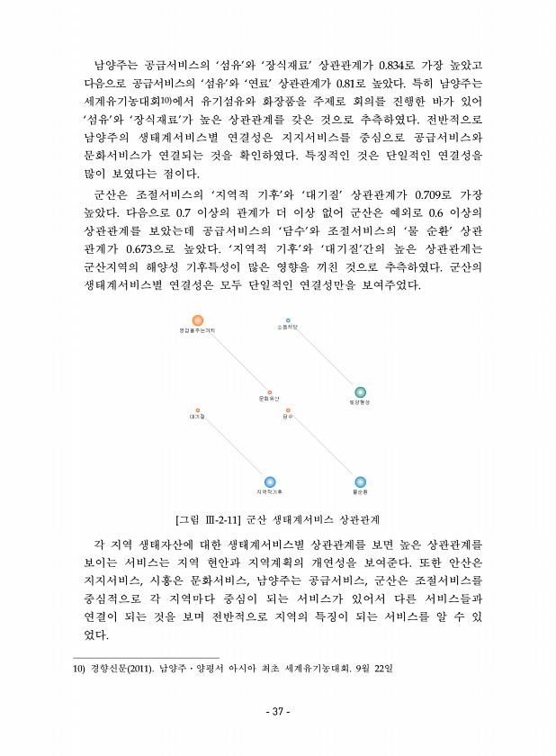 남양주는 공급서비스의 ‘섬유’와 ‘장식재료’ 상관관계가 0.834로 가장 높았고 다음으로 공급서비스의 ‘섬유’와 ‘연료’ 상관관계가 0.81로 높았다. 특히 남양주는 세계유기농대회10 에서 유기섬유와 화장품을 주제로 회의를 진행한 바가 있어 ‘섬유’와 ‘장식재료’가 높은 상관관계를 갖은 것으로 추측하였다. 전반적으로 남양주의 생태계서비스별 연결성은 지지서비스를 중심으로 공급서비스와 문화서비스가 연결되는 것을 확인하였다. 특징적인 것은 단일적인 연결성을 많이 보였다는 점이다. 군산은 조절서비스의 ‘지역적 기후’와 ‘대기질’ 상관관계가 0.709로 가장 높았다. 다음으로 0.7 이상의 관계가 더 이상 없어 군산은 예외로 0.6 이상의 상관관계를 보았는데 공급서비스의 ‘담수’와 조절서비스의 ‘물 순환’ 상관 관계...