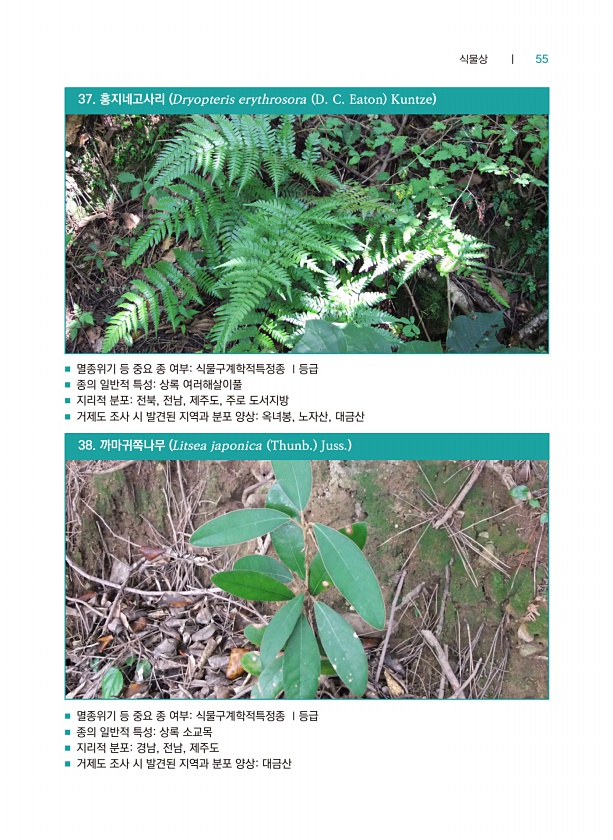 식물상 ┃ 55 ■ 멸종위기 등 중요 종 여부식물구계학적특정종 Ⅰ등급 ■ 종의 일반적 특성상록 여러해살이풀 ■ 지리적 분포전북, 전남, 제주도, 주로 도서지방 ■ 거제도 조사 시 발견된 지역과 분포 양상옥녀봉, 노자산, 대금산 ■ 멸종위기 등 중요 종 여부식물구계학적특정종 Ⅰ등급 ■ 종의 일반적 특성상록 소교목 ■ 지리적 분포경남, 전남, 제주도 ■ 거제도 조사 시 발견된 지역과 분포 양상대금산 37. 홍지네고사리 Dryopteris erythrosora D. C. Eaton Kuntze 38. 까마귀쪽나무 Litsea japonica Thunb. Juss.