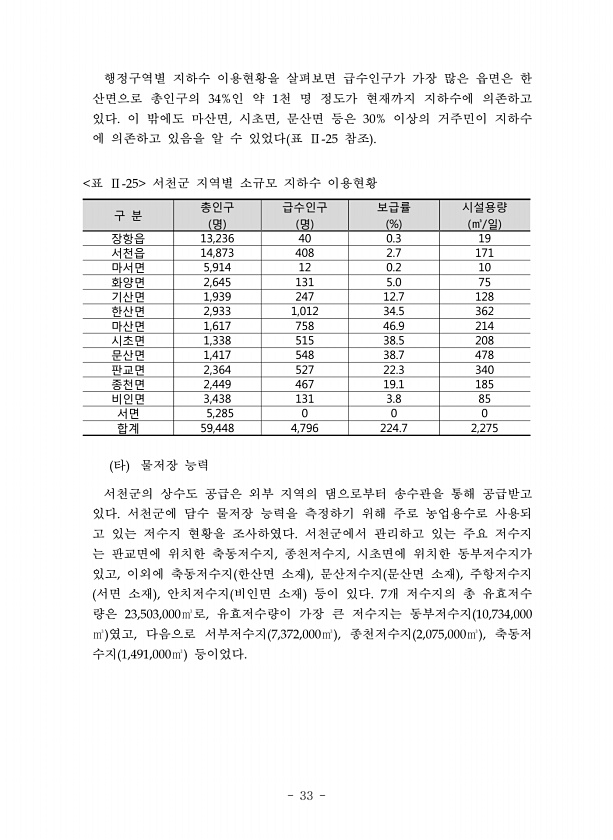 33 행정구역별 지하수 이용현황을 살펴보면 급수인구가 가장 많은 읍면은 한 산면으로 총인구의 인 약 천 명 정도가 현재까지 지하수에 의존하고 있다 이 밖에도 마산면 시초면 문산면 등은 이상의 거주민이 지하수 에 의존하고 있음을 알 수 있었다 표 참조 구 분 총인구 명 급수인구 명 보급률 % 시설용량 ㎥/일 장항읍 13,236 40 0.3 19 서천읍 14,873 408 2.7 171 마서면 5,914 12 0.2 10 화양면 2,645 131 5.0 75 기산면 1,939 247 12.7 128 한산면 2,933 1,012 34.5 362 마산면 1,617 758 46.9 214 시초면 1,338 515 38.5 208 문산면 1,417 548 38.7 478 판교면 2,364 527 22.3 340 종천면...