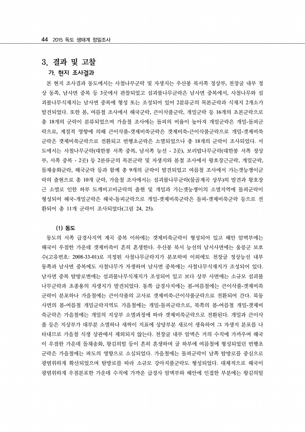 44 2015 독도 생태계 정밀조사 3. 결과 및 고찰 가. 현지 조사결과 본 현지 조사결과 동도에서는 사철나무군락 및 자생지는 우산봉 북서쪽 정상부, 천장굴 내부 정 상 동쪽, 남사면 중복 등 3곳에서 관찰되었고 섬괴불나무군락은 남사면 중복에서, 사철나무와 섬 괴불나무식재지는 남사면 중복에 형성 또는 조성되어 있어 2분류군의 목본군락과 식재지 2개소가 발견되었다. 또한 봄, 여름철 조사에서 해국군락, 큰이삭풀군락, 개밀군락 등 16개의 초본군락으로 총 18개의 군락이 분류되었으며 가을철 조사에는 돌피의 비율이 높아져 개밀군락은 개밀-돌피군 락으로, 계절적 영향에 의해 큰이삭풀-갯제비쑥군락은 갯제비쑥-큰이삭풀군락으로 개밀-갯제비쑥 군락은 갯제비쑥군락으로 전환되고 번행초군락은 소멸되었으나 총 18개의 군락이 ...
