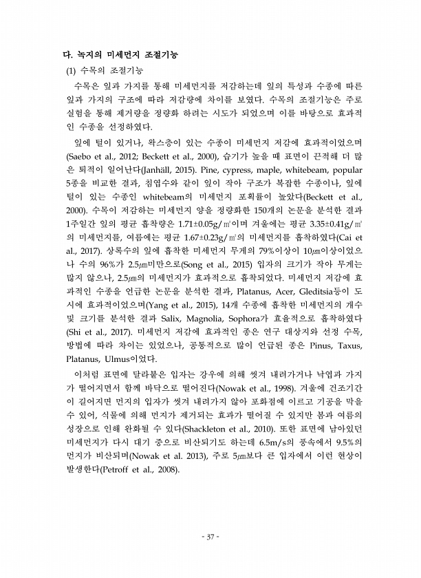37 다 녹지의 미세먼지 조절기능 수목의 조절기능 수목은 잎과 가지를 통해 미세먼지를 저감하는데 잎의 특성과 수종에 따른 잎과 가지의 구조에 따라 저감량에 차이를 보였다 수목의 조절기능은 주로 실험을 통해 제거량을 정량화 하려는 시도가 되었으며 이를 바탕으로 효과적 인 수종을 선정하였다 잎에 털이 있거나 왁스층이 있는 수종이 미세먼지 저감에 효과적이었으며 습기가 높을 때 표면이 끈적해 더 많 은 퇴적이 일어난다 종을 비교한 결과 침엽수와 같이 잎이 작아 구조가 복잡한 수종이나 잎에 털이 있는 수종인 의 미세먼지 포획률이 높았다 수목이 저감하는 미세먼지 양을 정량화한 개의 논문을 분석한 결과 주일간 잎의 평균 흡착량은 이며 겨울에는 평균 의 미세먼지를 여름에는 평균 의 미세먼지를 흡착하였다 상록수의 잎에 흡착...