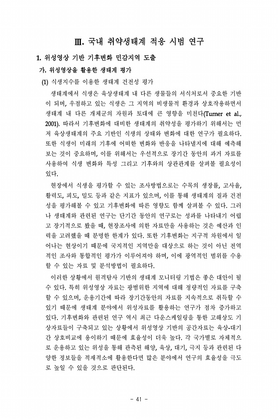 41 국내 취약생태계 적응 시범 연구 위성영상 기반 기후변화 민감지역 도출 가 위성영상을 활용한 생태계 평가 식생지수를 이용한 생태계 건전성 평가 생태계에서 식생은 육상생태계 내 다른 생물들의 서식처로서 중요한 기반 이 되며 우점하고 있는 식생은 그 지역의 비생물적 환경과 상호작용하면서 생태계 내 다른 개체군의 자원과 토대에 큰 영향을 미친다 따라서 기후변화에 대비한 생태계의 취약성을 평가하기 위해서는 먼 저 육상생태계의 주요 기반인 식생의 상태와 변화에 대한 연구가 필요하다 또한 식생이 미래의 기후에 어떠한 변화와 반응을 나타낼지에 대해 예측해 보는 것이 중요하며 이를 위해서는 우선적으로 장기간 동안의 과거 자료를 사용하여 식생 변화와 특성 그리고 기후와의 상관관계를 살펴볼 필요성이 있다 현장에서 식생을 ...