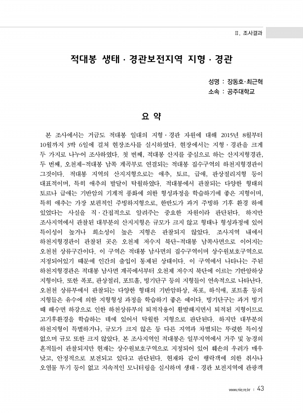 Ⅱ. 조사결과 www.nie.re.kr ? 43 적대봉 생태·경관보전지역 지형·경관 성명 장동호·최근혁 소속 공주대학교 요 약 본 조사에서는 거금도 적대봉 일대의 지형·경관 자원에 대해 2015년 8월부터 10월까지 3박 6일에 걸쳐 현장조사를 실시하였다. 현장에서는 지형·경관을 크게 두 가지로 나누어 조사하였다. 첫 번째, 적대봉 산지를 중심으로 하는 산지지형경관, 두 번째, 오천제적대봉 남쪽 계곡부로 연결되는 적대봉 집수구역의 하천지형경관이 그것이다. 적대봉 지역의 산지지형으로는 애추, 토르, 급애, 판상절리지형 등이 대표적이며, 특히 애추의 발달이 탁월하였다. 적대봉에서 관찰되는 다양한 형태의 토르나 급애는 기반암의 기계적 풍화에 의한 형성과정을 학습하기에 좋은 지형이며, 특히 애추는 가장 보편적인 주...