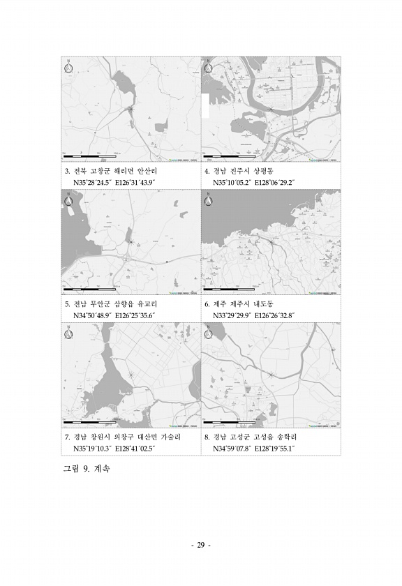 29 3. 전북 고창군 해리면 안산리 N35˚28´24.5˝ E126˚31´43.9˝ 4. 경남 진주시 상평동 N35˚10´05.2˝ E128˚06´29.2˝ 5. 전남 무안군 삼향읍 유교리 N34˚50´48.9˝ E126˚25´35.6˝ 6. 제주 제주시 내도동 N33˚29´29.9˝ E126˚26´32.8˝ 7. 경남 창원시 의창구 대산면 가술리 N35˚19´10.3˝ E128˚41´02.5˝ 8. 경남 고성군 고성읍 송학리 N34˚59´07.8˝ E128˚19´55.1˝ 그림 9.계속
