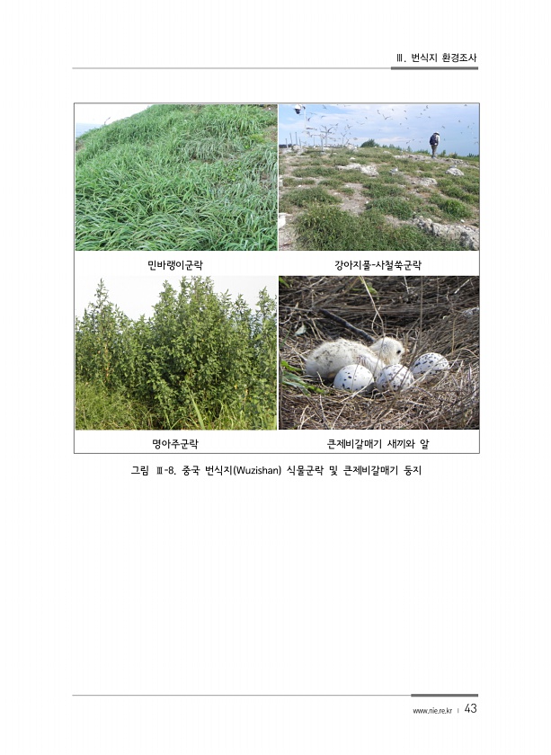 Ⅲ. 번식지 환경조사 www.nie.re.kr ? 43 민바랭이군락 강아지풀-사철쑥군락 명아주군락 큰제비갈매기 새끼와 알 그림 Ⅲ-8. 중국 번식지 Wuzishan 식물군락 및 큰제비갈매기둥지