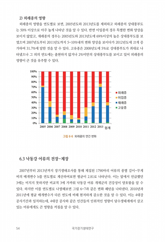 54 국가장기생태연구 2 외래종의 영향 외래종의 영향을 연도별로 보면, 2005년도와 2013년도를 제외하고 외래종의 상대풍부도 는 50% 이상으로 아주 높게 나타난 것을 알 수 있다. 반면 이입종의 경우 특별한 변화 양상을 보이지 않았고, 재래종의 경우는 2005년도와 2013년도에 69%이상의 높은 상대풍부도를 보 였으며 2007년도부터 2011년도까지 5-10%내의 변화 양상을 보이다가 2012년도에 크게 증 가하여 31.7%에 달한 것을 알 수 있다. 고유종은 2008년도에 5%로 상대풍부도가 최대로 나 타냈으나 그 외의 연도에는 출현하지 않거나 2%미만의 상대풍부도를 보이고 있어 외래종의 영향이 큰 것을 유추할 수 있다. 6.3 낙동강 어류의 전장-체장 2007년부터 2013년까지 장기생태조사를 통...