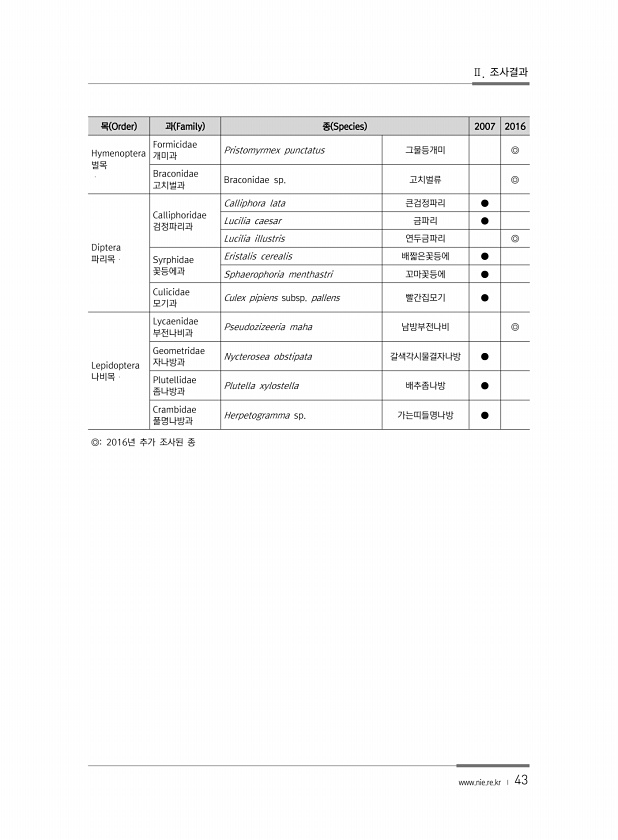 Ⅱ. 조사결과 www.nie.re.kr ? 43 목 Order 과 Family 종 Species 2007 2016 Hymenoptera 벌목 Formicidae 개미과 Pristomyrmex punctatus 그물등개미 ◎ Braconidae 고치벌과 Braconidae sp. 고치벌류 ◎ Diptera 파리목 Calliphoridae 검정파리과 Calliphora lata 큰검정파리 ● Lucilia caesar 금파리 ● Lucilia illustris 연두금파리 ◎ Syrphidae 꽃등에과 Eristalis cerealis 배짧은꽃등에 ● Sphaerophoria menthastri 꼬마꽃등에 ● Culicidae 모기과 Culex pipiens subsp. pallens 빨간집모기 ● Lepido...