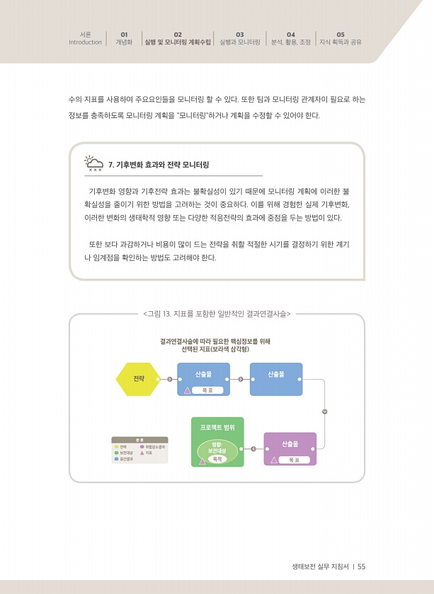 생태보전 실무 지침서 | 55 서론 Introduction 01 개념화 02 실행 및 모니터링 계획수립 03 실행과 모니터링 04 분석, 활용, 조정 05 지식 획득과 공유 수의 지표를 사용하여 주요요인들을 모니터링 할 수 있다. 또한 팀과 모니터링 관계자이 필요로 하는 정보를 충족하도록 모니터링 계획을 모니터링하거나 계획을 수정할 수 있어야 한다. 7. 기후변화 효과와 전략 모니터링 기후변화 영향과 기후전략 효과는 불확실성이 있기 때문에 모니터링 계획에 이러한 불 확실성을 줄이기 위한 방법을 고려하는 것이 중요하다. 이를 위해 경험한 실제 기후변화, 이러한 변화의 생태학적 영향 또는 다양한 적응전략의 효과에 중점을 두는 방법이 있다. 또한 보다 과감하거나 비용이 많이 드는 전략을 취할 적절한 시기를 결정하...