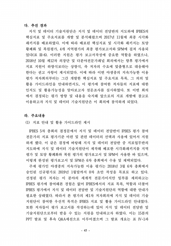 다. 추진 경과 지식 및 데이터 기술지원단은 지식 및 데이터 전담반의 지도하에 IPBES의 핵심지표 및 주요지표를 개발 및 분석해왔으며 2017년 11월에 최종 시각화 패키지를 배포하였다. 이에 따라 배포된 핵심지표 및 시각화 패키지는 토양 황폐화 및 복원평가, 4개 지역평가의 최종 평가보고서와 SPM에 걸쳐 사용되 었다 표 III-6 이러한 지원은 평가 보고서작성에 중요한 역할을 하였으나, 2018년 10월 제12차 의장단 및 다분야전문가패널 회의에서는 향후 평가에서 지표 지원이 하향식보다는 상향식, 즉 저자의 수요에 맞춤형으로 대응해야 한다는 권고 사항이 제시되었다. 이에 따라 이번 야생종의 지속가능한 이용 평가 저자회의부터는 그간 개발한 핵심지표 및 주요지표 목록, 그 의의 및 활용 가이드라인을 안내하...