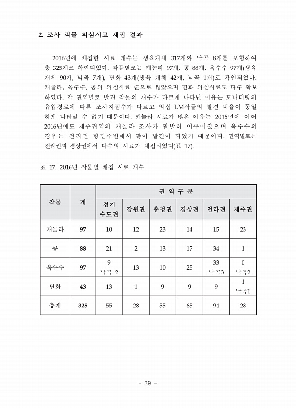 2. 조사 작물 의심시료 채집 결과 2016년에 채집한 시료 개수는 생육개체 317개와 낙곡 8개를 포함하여 총 325개로 확인되었다. 작물별로는 캐놀라 97개, 콩 88개, 옥수수 97개 생육 개체 90개, 낙곡 7개 , 면화 43개 생육 개체 42개, 낙곡 1개 로 확인되었다. 캐놀라, 옥수수, 콩의 의심시료 순으로 많았으며 면화 의심시료도 다수 확보 하였다. 각 권역별로 발견 작물의 개수가 다르게 나타난 이유는 모니터링의 유입경로에 따른 조사지점수가 다르고 의심 LM작물의 발견 비율이 동일 하게 나타날 수 없기 때문이다. 캐놀라 시료가 많은 이유는 2015년에 이어 2016년에도 제주권역의 캐놀라 조사가 활발히 이루어졌으며 옥수수의 경우는 전라권 항만주변에서 많이 발견이 되었기 때문이다. 권역별로는 전...