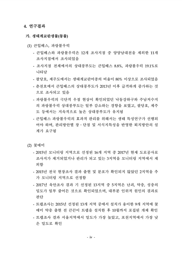 iv 4. 연구결과 가. 생태계교란생물 동물 1 큰입배스, 파랑볼우럭 큰입배스와 파랑볼우럭은 12개 조사지점 중 양양남대천을 제외한 11개 조사지점에서 조사되었음 조사지점 전체에서의 상대풍부도는 큰입배스 8.8%, 파랑볼우럭 19.1%로 나타남 팔당호, 제주도에서는 생태계교란어종의 비율이 80% 이상으로 조사되었음 춘천호에서 큰입배스의 상대풍부도가 2013년 이후 급격하게 증가하는 것 으로 조사되고 있음 파랑볼우럭의 극단적 우점 현상이 확인되었던 낙동강하구와 주남저수지 의 파랑볼우럭 상대풍부도는 일부 감소하는 경향을 보였고, 팔당호, 제주 도 등에서는 지속적으로 높은 상대풍부도가 유지됨 큰입배스 파랑볼우럭의 효과적 관리를 위해서는 생태 특성연구가 선행되 어야 하며, 관리방안별 장?단점 및 서식지특성을 반영한...