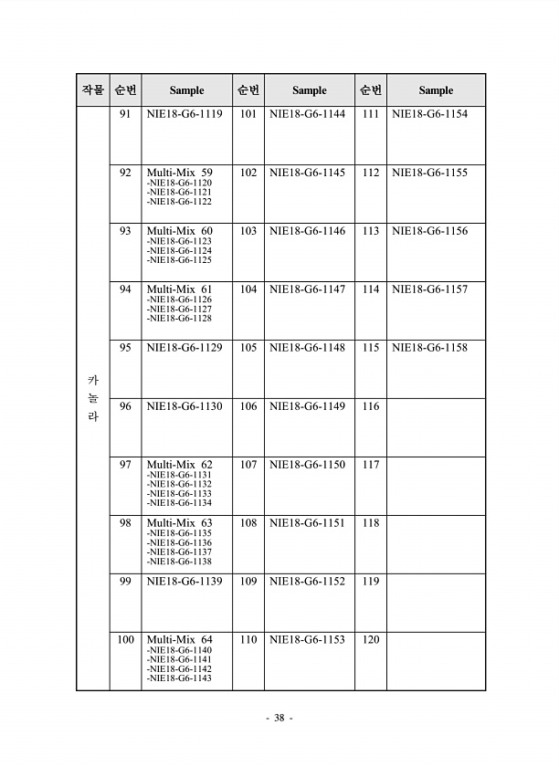 38 작물 순번 Sample 순번 Sample 순번 Sample 카 놀 라 91 NIE18-G6-1119 101 NIE18-G6-1144 111 NIE18-G6-1154 92 Multi-Mix 59 -NIE18-G6-1120 -NIE18-G6-1121 -NIE18-G6-1122 102 NIE18-G6-1145 112 NIE18-G6-1155 93 Multi-Mix 60 -NIE18-G6-1123 -NIE18-G6-1124 -NIE18-G6-1125 103 NIE18-G6-1146 113 NIE18-G6-1156 94 Multi-Mix 61 -NIE18-G6-1126 -NIE18-G6-1127 -NIE18-G6-1128 104 NIE18-G6-1147 114 NIE18-G6-1157 95 NIE18-G6-11...