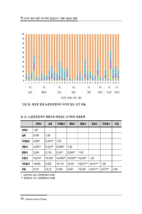 2018 생태·경관 우수지역 발굴조사 경북 내성천 일대 46 ? National Institute of Ecology 그림 20. 내성천 일대 노란잔산잠자리 서식처 입도 크기 비율. 개체수 실트 극세립사 세립사 중립사 조립사 극조립사 자갈 개체수 1.00 실트 0.199 1.00 극세립사 0.365* 0.843** 1.00 세립사 0.478** 0.520** 0.684** 1.00 중립사 0.264 0.153 0.341* 0.586** 1.00 조립사 -0.374* -0.362* -0.486** -0.609** -0.385* 1.00 극조립사 -0.030 0.002 -0.155 -0.261 -0.617** -0.411** 1.00 자갈 0.131 -0.22 0.030 0.087 -0.208 -0.611** ...