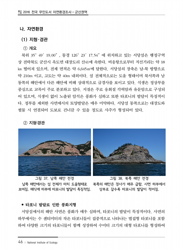 2016 전국 무인도서 자연환경조사 군산권역 46 ? National Institute of Ecology 나. 자연환경 1 지형?경관 ① 개요 북위 35°49′19.00″, 동경 126°23′17.54″에 위치하고 있는 서당섬은 행정구역 상 전락북도 군산시 옥도면 대장도리 산41에 속한다. 비응항으로부터 직선거리는 약 18 ㎞ 떨어져 있으며, 전제 면적은 약 6,645㎡에 달한다. 서당섬의 장축은 남-북 방향으로 약 210m 이고, 고도는 약 40m 내외이다. 섬 전체적으로는 도움 형태이며 북서쪽과 남 동쪽의 해안에서 다른 해안에 비해 상대적으로 급경사를 보이고 있다. 식생은 정상부를 중심으로 교목이 주로 분포하고 있다. 지질은 주로 응회질 각력암과 유문암으로 구성되 어 있으며, 식생이 없이 노출된 암석은...