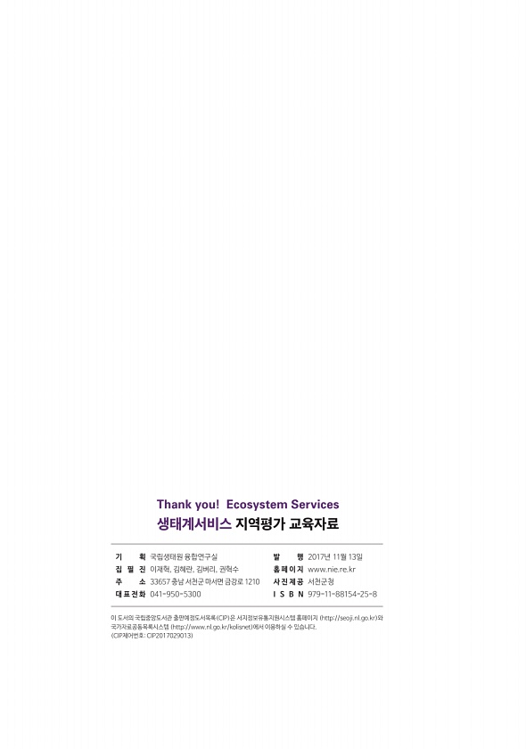 기 획 국립생태원 융합연구실 집 필 진 이재혁, 김혜란, 김벼리, 권혁수 주 소 33657 충남 서천군 마서면 금강로 1210 대 표 전 화 041-950-5300 발 행 2017년 11월 13일 홈 페 이 지 www.nie.re.kr 사 진 제 공 서천군청 I S B N 979-11-88154-25-8 이 도서의 국립중앙도서관 출판예정도서목록 CIP 은 서지정보유통지원시스템 홈페이지 http//seoji.nl.go.kr 와 국가자료공동목록시스템 http//www.nl.go.kr/kolisnet 에서 이용하실 수 있습니다. CIP제어번호CIP2017029013 생태계서비스 지역평가 교육자료 Thank you! EcosystemServices