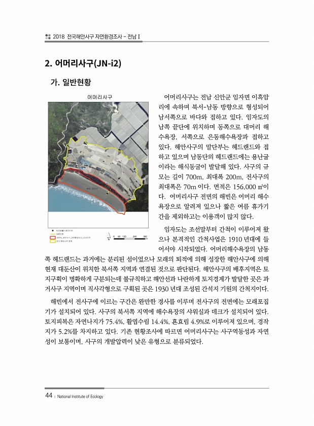 2018 전국해안사구 자연환경조사 전남Ⅰ 44 ? National Institute of Ecology 2. JN-i2 어머리사구는 전남 신안군 임자면 이흑암 리에 속하며 북서-남동 방향으로 형성되어 남서쪽으로 바다와 접하고 있다. 임자도의 남쪽 끝단에 위치하며 동쪽으로 대머리 해 수욕장, 서쪽으로 은동해수욕장과 접하고 있다. 해안사구의 말단부는 헤드랜드와 접 하고 있으며 남동단의 헤드랜드에는 용난굴 이라는 해식동굴이 발달해 있다. 사구의 규 모는 길이 700m, 최대폭 200m, 전사구의 최대폭은 70m 이다. 면적은 156,000 ㎡이 다. 어머리사구 전면의 해빈은 어머리 해수 욕장으로 알려져 있으나 짧은 여름 휴가기 간을 제외하고는 이용객이 많지 않다. 임자도는 조선말부터 간척이 이루어져 왔 으나 본격...