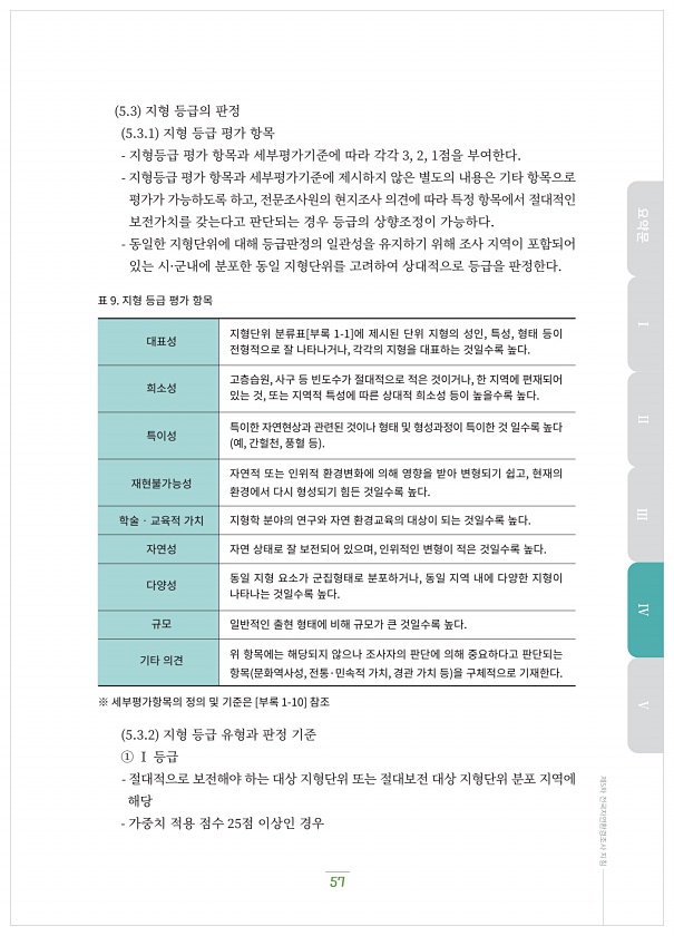 57 제5차 전국자연환경조사 지침 ?.? 지형?등급의?판정 ?.?.? 지형?등급?평가?항목 지형등급?평가?항목과?세부평가기준에?따라?각각 ?, ?, ?점을?부여한다. 지형등급?평가?항목과?세부평가기준에?제시하지?않은?별도의?내용은?기타?항목으로 평가가?가능하도록?하고, 전문조사원의?현지조사?의견에?따라?특정?항목에서?절대적인 보전가치를?갖는다고?판단되는?경우?등급의?상향조정이?가능하다. 동일한?지형단위에?대해?등급판정의?일관성을?유지하기?위해?조사?지역이?포함되어 있는?시·군내에?분포한?동일?지형단위를?고려하여?상대적으로?등급을?판정한다. 표 9. 지형?등급?평가?항목 대표성 희소성 지형학?분야의?연구와?자연?환경교육의?대상이?되는?것일수록?높다. 자연?상태로?잘?보전되어?있으며, 인위적인?변형이?적은?것일...