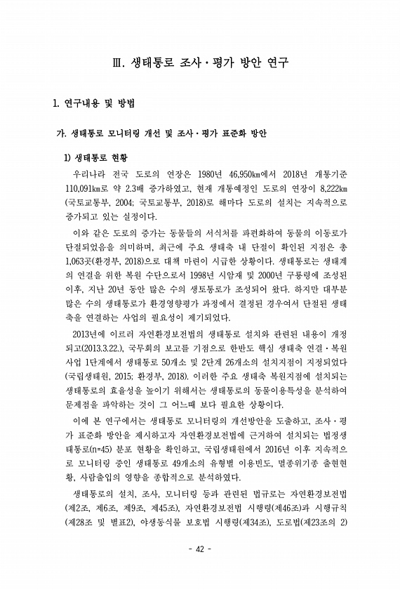 42 Ⅲ. 생태통로 조사·평가 방안 연구 1. 연구내용 및 방법 가. 생태통로 모니터링 개선 및 조사·평가 표준화 방안 1 생태통로 현황 우리나라 전국 도로의 연장은 1980년 46,950㎞에서 2018년 개통기준 110,091㎞로 약 2.3배 증가하였고, 현재 개통예정인 도로의 연장이 8,222㎞ 국토교통부, 2004; 국토교통부, 2018 로 해마다 도로의 설치는 지속적으로 증가되고 있는 실정이다. 이와 같은 도로의 증가는 동물들의 서식처를 파편화하여 동물의 이동로가 단절되었음을 의미하며, 최근에 주요 생태축 내 단절이 확인된 지점은 총 1,063곳 환경부, 2018 으로 대책 마련이 시급한 상황이다. 생태통로는 생태계 의 연결을 위한 복원 수단으로서 1998년 시암재 및 2000년 구룡령에 조성된 이후...