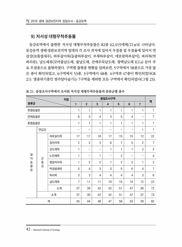 2018 생태·경관보전지역 정밀조사 동강유역 42 ? National Institute of Ecology 9 동강유역에서 출현한 저서성 대형무척추동물은 82종 62,019개체/21㎡로 나타났다. 동강유역 생태?경관보전지역 일대의 각 조사 격자에 있어서 우점종 및 우점율에 있어서 연 갑강 보통옆새우 , 하루살이목 등줄하루살이, 부채하루살이, 애호랑하루살이 , 파리목 먹 파리류 , 날도래류 꼬마줄날도래, 줄날도래, 큰애우묵날도래, 광택날도래 KUa 등이 주 요 우점종으로 출현하였다. 구역별 출현종 현황을 살펴보면, 5구역에서 58종으로 가장 많 은 종이 확인되었고, 6구역에서 53종, 3구역에서 48종, 4구역과 47종이 확인되었다 표 21 멸종위기종인 염주알다슬기는 7구역을 제외한 모든 구역에서 확인되었다 ...