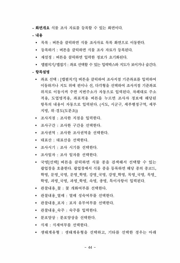 44 화면개요 식물 조사 자료를 등록할 수 있는 화면이다. 내용 ? 목록 버튼을 클릭하면 식물 조사자료 목록 화면으로 이동한다. ? 등록하기 버튼을 클릭하면 식물 조사 자료가 등록된다. ? 재설정 버튼을 클릭하면 입력한 정보가 초기화된다. ? 맵펼치기/맵접기 좌표 선택할 수 있는 입력박스와 지도가 보이거나 숨긴다. 항목설명 ? 좌표 선택 [맵펼치기] 버튼을 클릭하여 조사지점 기준좌표를 입력하여 이동하거나 지도 위에 핀이나 선, 다각형을 선택하여 조사지점 기준좌표 위치로 이동시켜 주면 지번주소가 자동으로 입력된다. 차례대로 주소 적용, 도엽명적용, 좌표적용 버튼을 누르면 조사자 정보에 해당된 항목의 내용이 자동으로 입력된다. 시도, 시군구, 세부행정구역, 세부 지명, 위·경도 도분초 ? 조사지점 조사한 지점을...