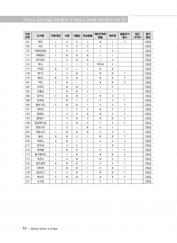 무인도서 보전가치등급 판정기준 안 및 특정도서 관리유형 분류기준 안 마련 연구 46 ? National Institute of Ecology 지정 번호 도서명 지형?경관 식생 식물상 육상동물 해안무척추 동물 해조류 멸종위기 종수 서식지 집단 평가 등급 167 변도 Ⅰ Ⅱ Ⅱ Ⅰ Ⅲ Ⅰ 1 2등급 169 석도 Ⅱ Ⅱ Ⅱ Ⅱ Ⅱ Ⅰ 2등급 170 아랫돈배섬 Ⅰ Ⅱ Ⅱ Ⅱ Ⅰ Ⅱ 2등급 171 내매물도 Ⅰ Ⅲ Ⅲ Ⅲ Ⅰ Ⅰ 2등급 172 진지외도 Ⅰ Ⅱ Ⅲ Ⅲ Ⅰ Ⅱ 2등급 174 토도 Ⅰ Ⅰ Ⅰ Ⅱ 미조사 Ⅱ 2등급 177 가덕도 Ⅲ Ⅱ Ⅰ Ⅰ Ⅲ Ⅲ 2등급 178 해1도 Ⅰ Ⅱ Ⅲ Ⅰ Ⅲ Ⅲ 1 2등급 179 해2도 Ⅲ Ⅱ Ⅲ Ⅰ Ⅲ Ⅲ 1 2등급 181 저도 Ⅱ Ⅲ Ⅰ Ⅰ Ⅲ Ⅲ 2 2등급 182 다라도 Ⅰ...
