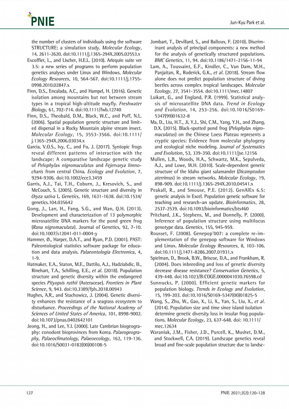 the number of clusters of individuals using the software STRUCTUREa simulation study. Molecular Ecology, 14, 2611-2620. doi10.1111/j.1365-294X.2005.02553.x Excoffier, L., and Lischer, H.E.L. 2010 Arlequin suite ver 3.5a new series of programs to perform population genetics analyses under Linux and Windows. Molecular Ecology Resources, 10, 564-567. doi10.1111/j.1755- 0998.2010.02847.x Finn, D.S., E...
