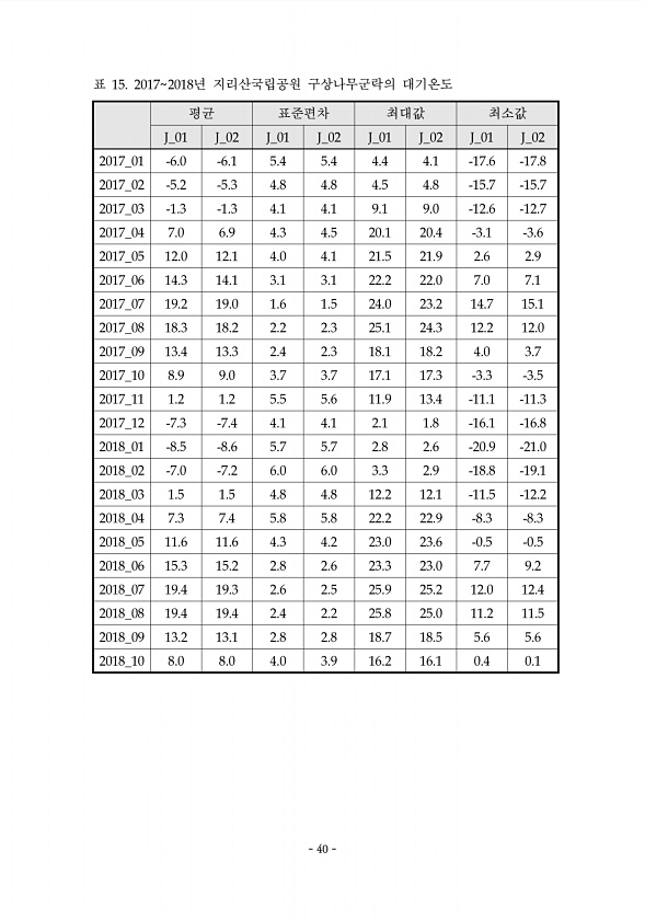 40 평균 표준편차 최대값 최소값 J_01 J_02 J_01 J_02 J_01 J_02 J_01 J_02 2017_01 -6.0 -6.1 5.4 5.4 4.4 4.1 -17.6 -17.8 2017_02 -5.2 -5.3 4.8 4.8 4.5 4.8 -15.7 -15.7 2017_03 -1.3 -1.3 4.1 4.1 9.1 9.0 -12.6 -12.7 2017_04 7.0 6.9 4.3 4.5 20.1 20.4 -3.1 -3.6 2017_05 12.0 12.1 4.0 4.1 21.5 21.9 2.6 2.9 2017_06 14.3 14.1 3.1 3.1 22.2 22.0 7.0 7.1 2017_07 19.2 19.0 1.6 1.5 24.0 23.2 14.7 15.1 2017_08 18.3 18.2 2.2 2.3...