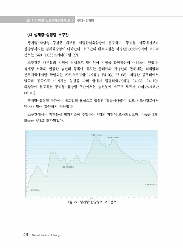 2018 백두대간보호지역 생태계 조사 댓재 삽당령 46 ? National Institute of Ecology 4 생계령삽당령 소구간 생계령삽당령 구간은 대부분 석병산석회암층이 분포하며, 두리봉 서쪽에서부터 삽당령까지는 임계화강암이 나타난다. 소구간의 대표지점은 석병산 1,055m 이며 고도의 분포는 6401,055m이다 그림 27 소구간은 대부분의 지역이 식생으로 덮여있어 지형을 확인하는데 어려움이 있었다. 생계령 서쪽의 민둥산 능선의 동쪽에 위치한 돌리네와 자병산의 돌리네는 석회암의 분포지역에서만 확인되는 카르스트지형이다 석병 E4-03, E5-08 석병산 봉우리에서 남쪽과 동쪽으로 이어지는 능선을 따라 급애가 발달하였다 석병 E4-08, E4-10 화강암이 분포하는 두리봉삽당령 구간에서는 능선부에 소...