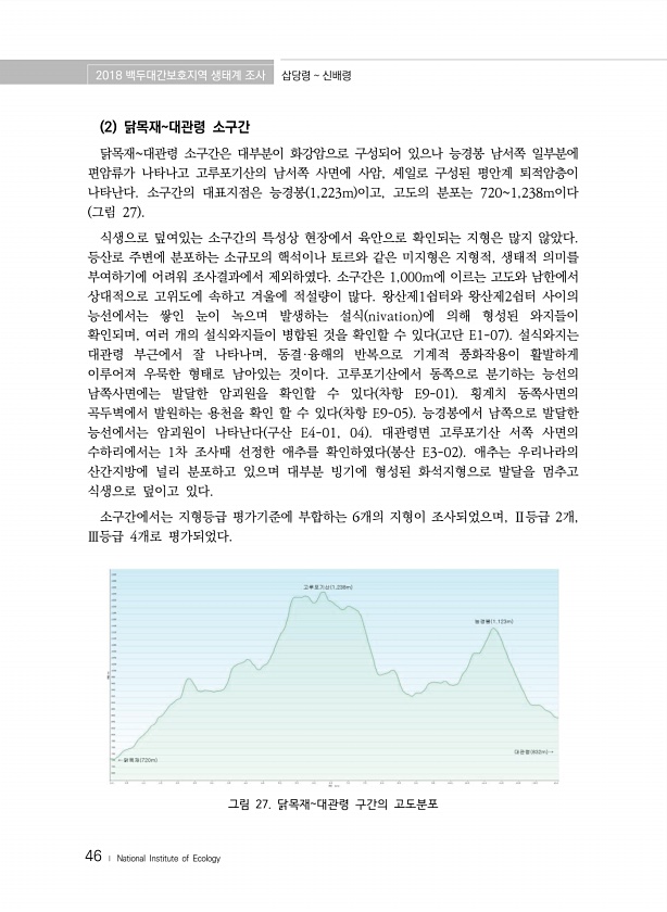 2018 백두대간보호지역 생태계 조사 삽당령 신배령 46 ? National Institute of Ecology 2 닭목재대관령 소구간 닭목재대관령 소구간은 대부분이 화강암으로 구성되어 있으나 능경봉 남서쪽 일부분에 편암류가 나타나고 고루포기산의 남서쪽 사면에 사암, 셰일로 구성된 평안계 퇴적암층이 나타난다. 소구간의 대표지점은 능경봉 1,223m 이고, 고도의 분포는 7201,238m이다 그림 27 식생으로 덮여있는 소구간의 특성상 현장에서 육안으로 확인되는 지형은 많지 않았다. 등산로 주변에 분포하는 소규모의 핵석이나 토르와 같은 미지형은 지형적, 생태적 의미를 부여하기에 어려워 조사결과에서 제외하였다. 소구간은 1,000m에 이르는 고도와 남한에서 상대적으로 고위도에 속하고 겨울에 적설량이 많다. 왕...