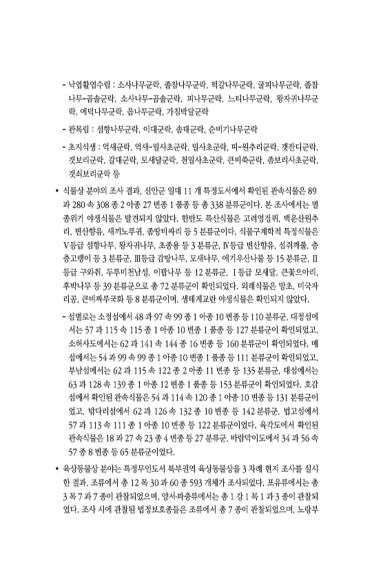낙엽활엽수림 소사나무군락, 졸참나무군락, 떡갈나무군락, 굴피나무군락, 졸참 나무-곰솔군락, 소사나무-곰솔군락, 피나무군락, 느티나무군락, 왕자귀나무군 락, 예덕나무군락, 음나무군락, 가침박달군락 관목림 섬향나무군락, 이대군락, 솜대군락, 순비기나무군락 초지식생 억새군락, 억새-밀사초군락, 밀사초군락, 띠-원추리군락, 갯잔디군락, 갯보리군락, 갈대군락, 모새달군락, 천일사초군락, 큰비쑥군락, 좀보리사초군락, 갯쇠보리군락 등 ? 식물상 분야의 조사 결과, 신안군 일대 11 개 특정도서에서 확인된 관속식물은 89 과 280 속 308 종 2 아종 27 변종 1 품종 등 총 338 분류군이다. 본 조사에서는 멸 종위기 야생식물은 발견되지 않았다. 한반도 특산식물은 고려엉겅퀴, 백운산원추 리, 변산향유, 새끼노루귀,...