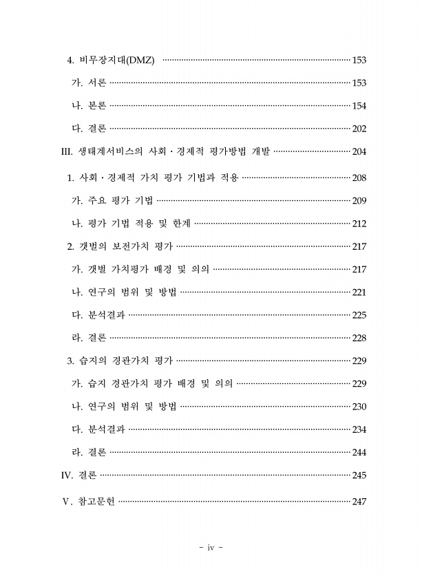 iv 비무장지대 가 서론 나 본론 다 결론 생태계서비스의 사회 경제적 평가방법 개발 사회 경제적 가치 평가 기법과 적용 가 주요 평가 기법 나 평가 기법 적용 및 한계 갯벌의 보전가치 평가 가 갯벌 가치평가 배경 및 의의 나 연구의 범위 및 방법 다 분석결과 라 결론 습지의 경관가치 평가 가 습지 경관가치 평가 배경 및 의의 나 연구의 범위 및 방법 다 분석결과 라 결론 결론참고문헌