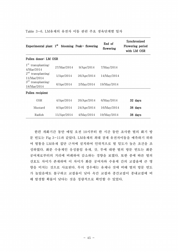 45 Table 3-6. LM유채의 유전자 이동 관련 주요 생육단계별 일자 Experimental plant 1st blooming Peak- flowering End of flowering Synchronized Flowering period with LM OSR Pollen donorLM OSR 1st transplanting4/Mar/2014 27/Mar/2014 9/Apr/2014 7/May/2014 2nd transplanting11/Mar/2014 1/Apr/2014 26/Apr/2014 14/May/2014 3rd transplanting18/Mar/2014 6/Apr/2014 2/May/2014 19/May/2014 Pollen recipient OSR 4/Apr/2014 20/Apr/2014...