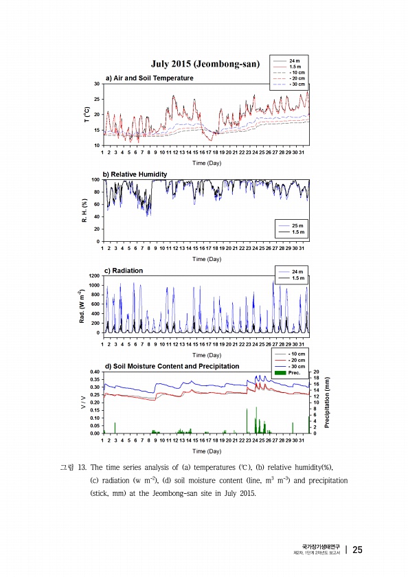 그림 13. The time series analysis of a temperatures ℃ , b relative humidity % , c radiation w m-2 , d soil moisture content line, m3 m-3 and precipitation stick, mm at the Jeombong-san site in July 2015. 국가장기생태연구 제2차, 1단계 2차년도 보고서 |25