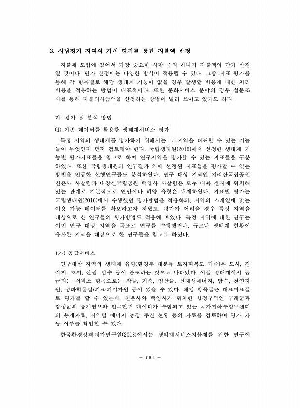 694 3. 시범평가 지역의 가치 평가를 통한 지불액 산정 지불제 도입에 있어서 가장 중요한 사항 중의 하나가 지불액의 단가 산정 일 것이다. 단가 산정에는 다양한 방식이 적용될 수 있다. 그중 지표 평가를 통해 각 항목별로 해당 생태계 기능이 없을 경우 발생할 비용에 대한 처리 비용을 적용하는 방법이 대표적이다. 또한 문화서비스 분야의 경우 설문조 사를 통해 지불의사금액을 산정하는 방법이 널리 쓰이고 있기도 하다. 가. 평가 및 분석 방법 1 기존 데이터를 활용한 생태계서비스 평가 특정 지역의 생태계를 평가하기 위해서는 그 지역을 대표할 수 있는 기능 들이 무엇인지 먼저 검토해야 한다. 국립생태원 2016 에서 선정한 생태계 기 능별 평가지표들을 참고로 하여 연구지역을 평가할 수 있는 지표들을 구분 하였다...