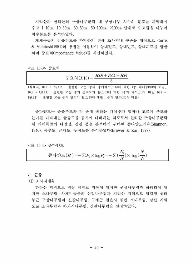20 지리산과 한라산의 구상나무군락 내 구상나무 치수의 분포를 파악하여 수고 1-10㎝, 10-30㎝, 30-50㎝, 50-100㎝, 100㎝ 단위로 수고급을 나누어 치수분포를 분석하였다. 개체목들의 점유정도를 파악하기 위해 조사지내 수종을 대상으로 Curtis & McIntosh 1951 의 방법을 이용하여 상대밀도, 상대빈도, 상대피도를 합산 하여 중요치 Importance Value 를 계산하였다. 표 Ⅱ-3 중요치 중요치 ? ? ? 식에서, RDi = ni/∑n 출현한 모든 종의 총개체수 ∑n 에 대한 i종 개체수 ni 의 비율, RCi = Ci/∑C 출현한 모든 종의 총피도의 합 ∑C 에 대한 i종의 피도 Ci 의 비율, RFi = Fi/∑F 출현한 모든 종의 ...