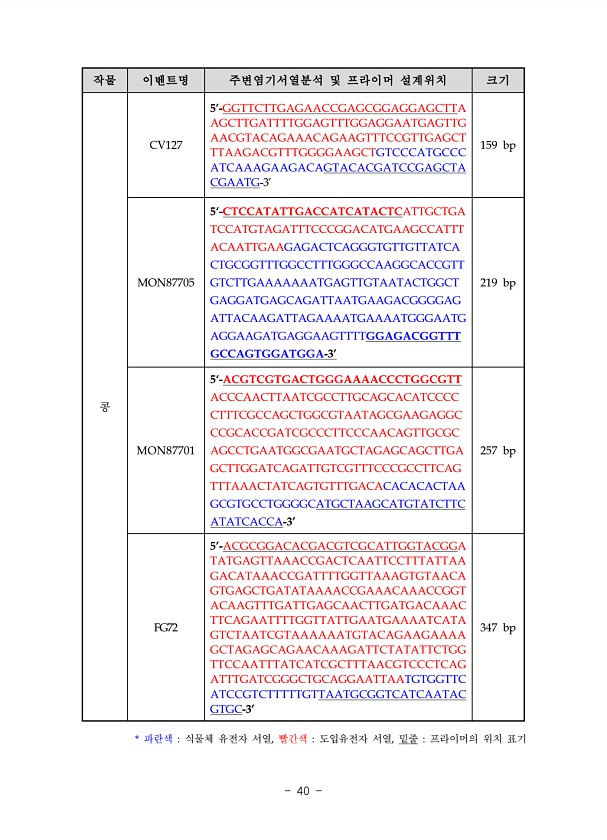 작물 이벤트명 주변염기서열분석 및 프라이머 설계위치 크기 콩 CV127 5-GGTTCTTGAGAACCGAGCGGAGGAGCTTA AGCTTGATTTTGGAGTTTGGAGGAATGAGTTG AACGTACAGAAACAGAAGTTTCCGTTGAGCT TTAAGACGTTTGGGGAAGCTGTCCCATGCCC ATCAAAGAAGACAGTACACGATCCGAGCTA CGAATG-3159 bp MON87705 5‘-CTCCATATTGACCATCATACTCATTGCTGA TCCATGTAGATTTCCCGGACATGAAGCCATTT ACAATTGAAGAGACTCAGGGTGTTGTTATCA CTGCGGTTTGGCCTTTGGGCCAAGGCACCGTT GTCTTGAAAAAAATGAGTTGTAATACTGGCT GAGGATGAGCAG...