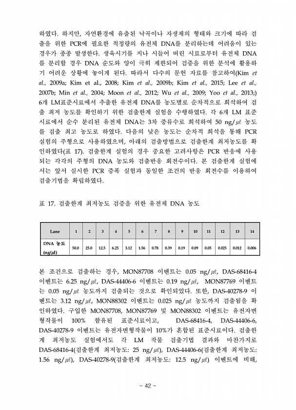Lane 1 2 3 4 5 6 7 8 9 10 11 12 13 14 DNA 농도 ng/㎕ 50.0 25.0 12.5 6.25 3.12 1.56 0.78 0.39 0.19 0.09 0.05 0.025 0.012 0.006 하였다. 하지만, 자연환경에 유출된 낙곡이나 자생체의 형태와 크기에 따라 검 출을 위한 PCR에 필요한 적정량의 유전체 DNA를 분리하는데 어려움이 있는 경우가 종종 발생한다. 생육시기를 지나 시들어 버린 시료로부터 유전체 DNA 를 분리할 경우 DNA 순도와 양이 극히 제한되어 검증을 위한 분석에 활용하 기 어려운 상황에 놓이게 된다. 따라서 다수의 문헌 자료를 참고하여 Kim et al., 2009a; Kim et al., 2008; Kim et al., 2009b; Kim et al.,...